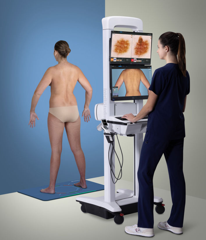 Captura totalmente automatizada de fotografías de mapas corporales. Las plantillas de captura del software DermaGraphix controlan la configuración de la cámara y guían las posturas del paciente, mientras que el elevador motorizado programable garantiza posiciones e iluminación repetibles de la cámara para fotografías consistentes de todo el cuerpo con una capacitación mínima del personal.
